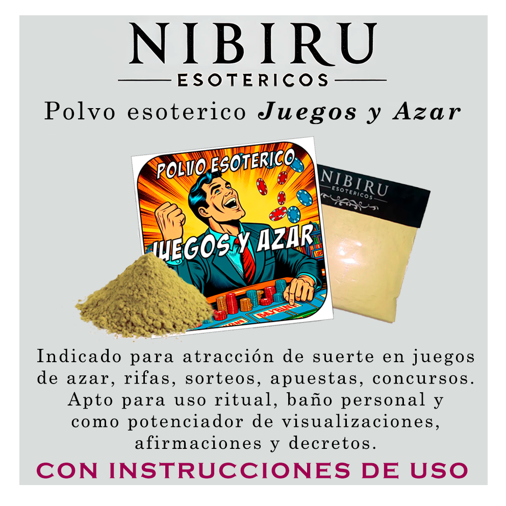 Preparado ritual formulado para atraer la buena suerte en juegos, rifas, sorteos, apuestas y situaciones de azar. Diseñado para quienes buscan ese golpe de fortuna capaz de cambiarlo todo, este polvo concentra energías de atracción, magnetismo y vibración afortunada, canalizando las oportunidades hacia el usuario. Ideal para potenciar rituales relacionados con el azar, inclinar la balanza a tu favor en momentos clave y atraer premios, ganancias inesperadas o resoluciones favorables. Se utiliza en juegos de quiniela, lotería, bingo, ruleta, apuestas deportivas o financieras, concursos, sorteos y para ritualizar boletos, fichas o billetes antes de participar.