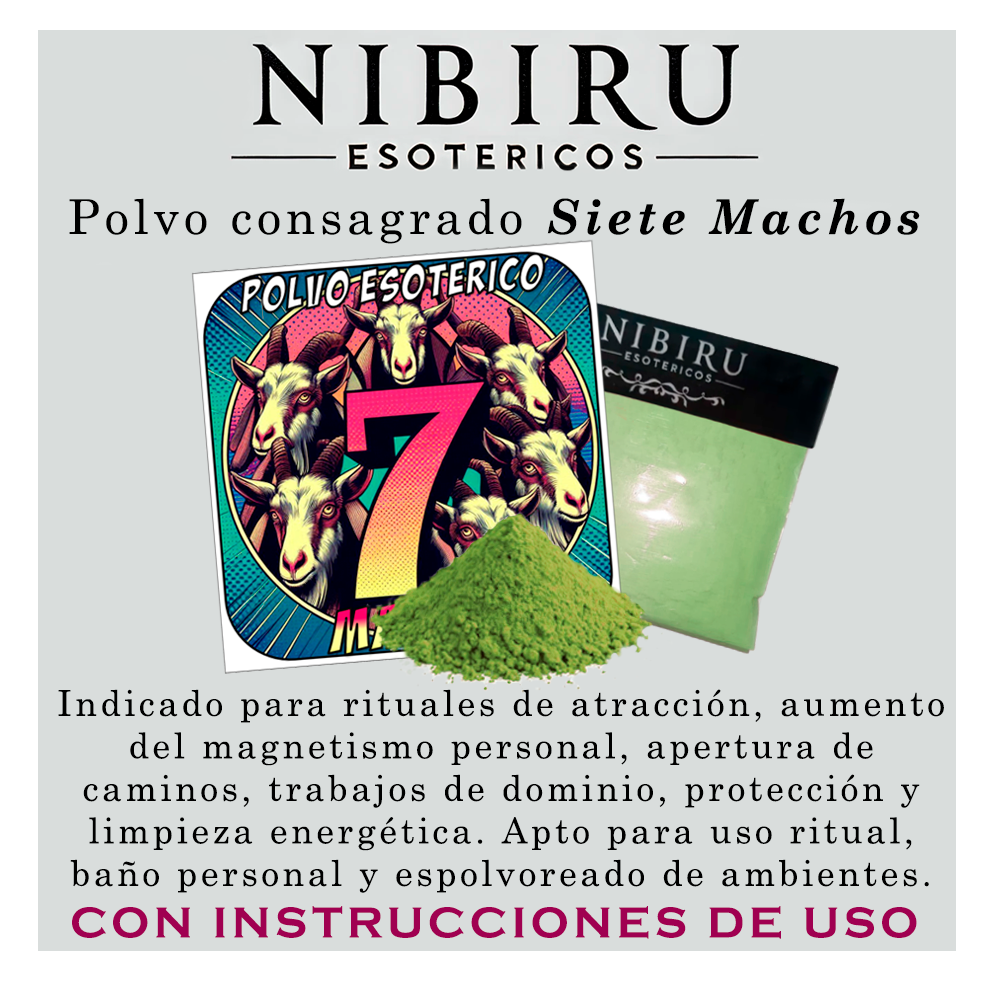 El Polvo Siete Machos es un preparado ritual de alta potencia, con esencias florales y cargas energéticas que concentran la fuerza vibratoria de siete flores macho, reconocidas por su capacidad para atraer buena suerte, magnetismo personal, protección espiritual y conquistas amorosas. Actúa canalizando energía masculina activa para abrir caminos, potenciar el aura personal y generar oportunidades en todos los planos. Se utiliza tanto en rituales de atracción y seducción como en trabajos de protección, dominio, virilidad y limpieza espiritual profunda. Su acción ayuda a eliminar energías densas, cortar maleficios, proteger contra envidias y chismes, y destrabar bloqueos en asuntos amorosos, económicos, laborales y espirituales, restaurando la buena fortuna y elevando la vibración del entorno.