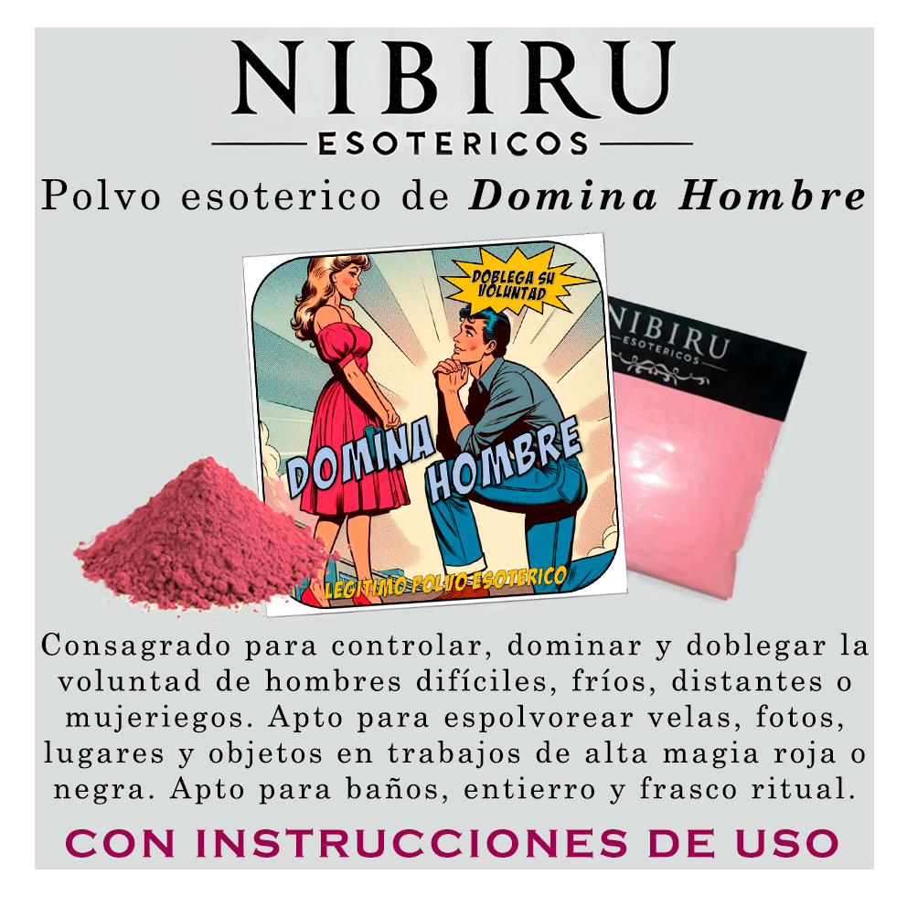 El Polvo Domina Hombre es un preparado esotérico consagrado para someter, dominar y controlar la voluntad de un hombre en el plano afectivo, sexual y emocional. Su fórmula trabaja intensamente sobre el ego, el deseo y la voluntad masculina, generando sumisión, docilidad y dependencia hacia quien realiza el ritual. Es ideal para establecer autoridad, reforzar el control dentro de una relación, imponer límites y lograr que el hombre obedezca, busque y necesite de manera constante a quien lo trabaja.