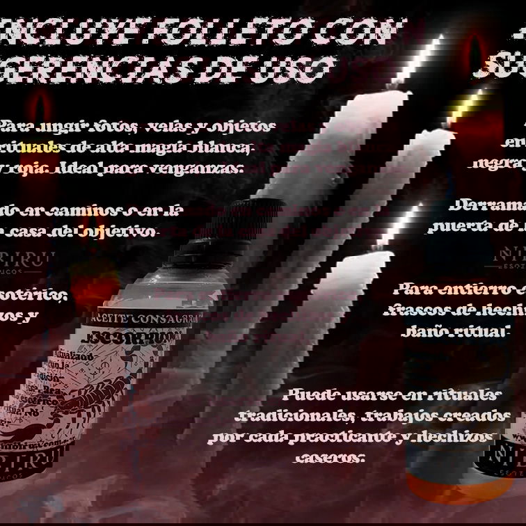 Apto para ungir velas, objetos y fotografías en trabajos de alta magia. Puede derramarse en la puerta de la persona trabajada, utilizarse en entierros esotéricos, frascos de hechizos y baño ritual. Incluye un folleto con sugerencias de uso, que cada practicante puede modificar para adaptar el producto a sus propios rituales.