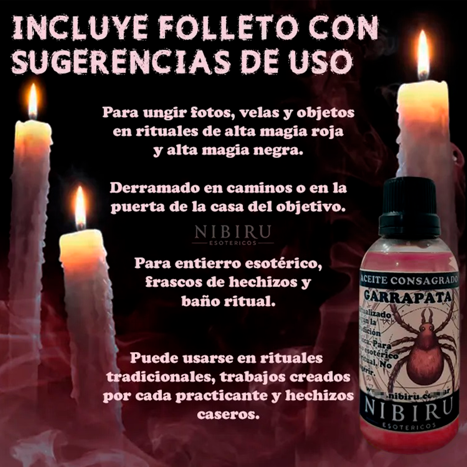 Apto para ungir velas, objetos y fotografías en trabajos de alta magia roja y negra. Puede derramarse en la puerta de la persona trabajada, utilizarse en entierros esotéricos, frascos de hechizos y baños rituales. Incluye un folleto con sugerencias de uso, que cada practicante puede modificar para adaptar el producto a sus propios rituales.