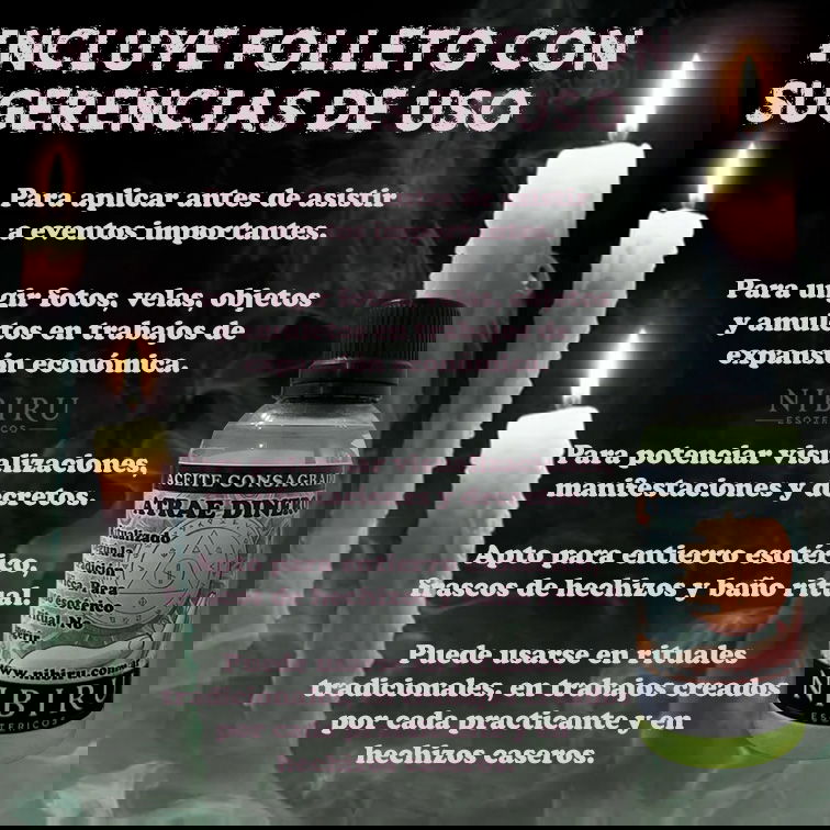Apto para aplicar en velas durante rituales de prosperidad y expansión económica. Puede derramarse en las esquinas de la casa o negocio para atraer ingresos de dinero, añadirse a baños esotéricos, acompañar ejercicios de manifestación y visualización y para crear frascos de hechizos. Incluye un folleto con sugerencias de uso, que cada practicante puede modificar para adaptar el producto a sus propios rituales.