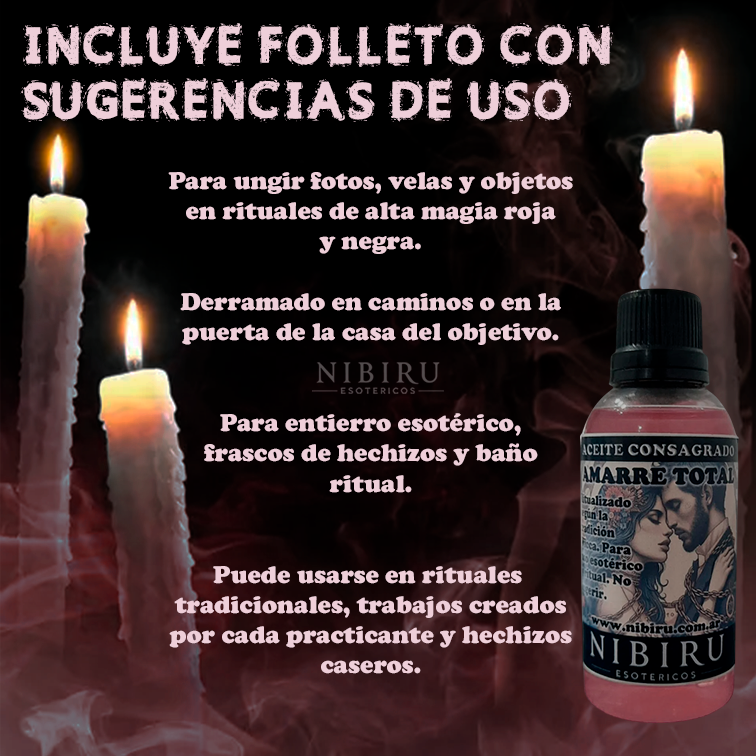 Advertencias: Amarre total es un elemento de alta magia roja. No se recomienda usarlo por curiosidad, impulso, o sobre personas por las que no tenés un interés real, ya sus efectos no siempre pueden revertirse. Usar con responsabilidad.