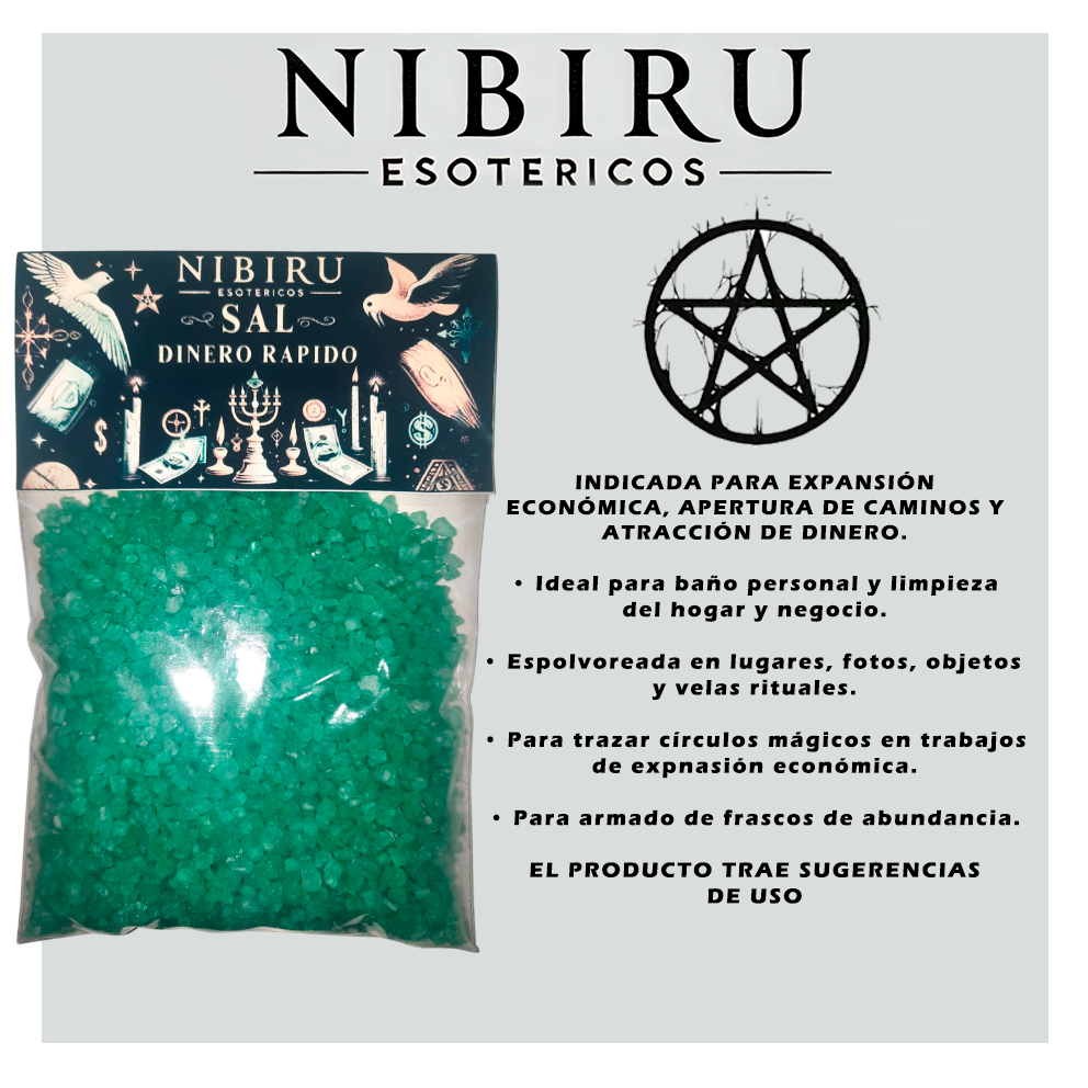 Sal esotérica consagrada para atraer ingresos inmediatos, abrir oportunidades económicas urgentes y destrabar caminos bloqueados. Su fórmula trabaja con alta vibración para acelerar el flujo de dinero, activar pagos retenidos, generar ventas rápidas o desbloquear situaciones financieras estancadas. Ideal para rituales de atracción exprés, peticiones económicas específicas y refuerzo energético de negocios o actividades laborales.