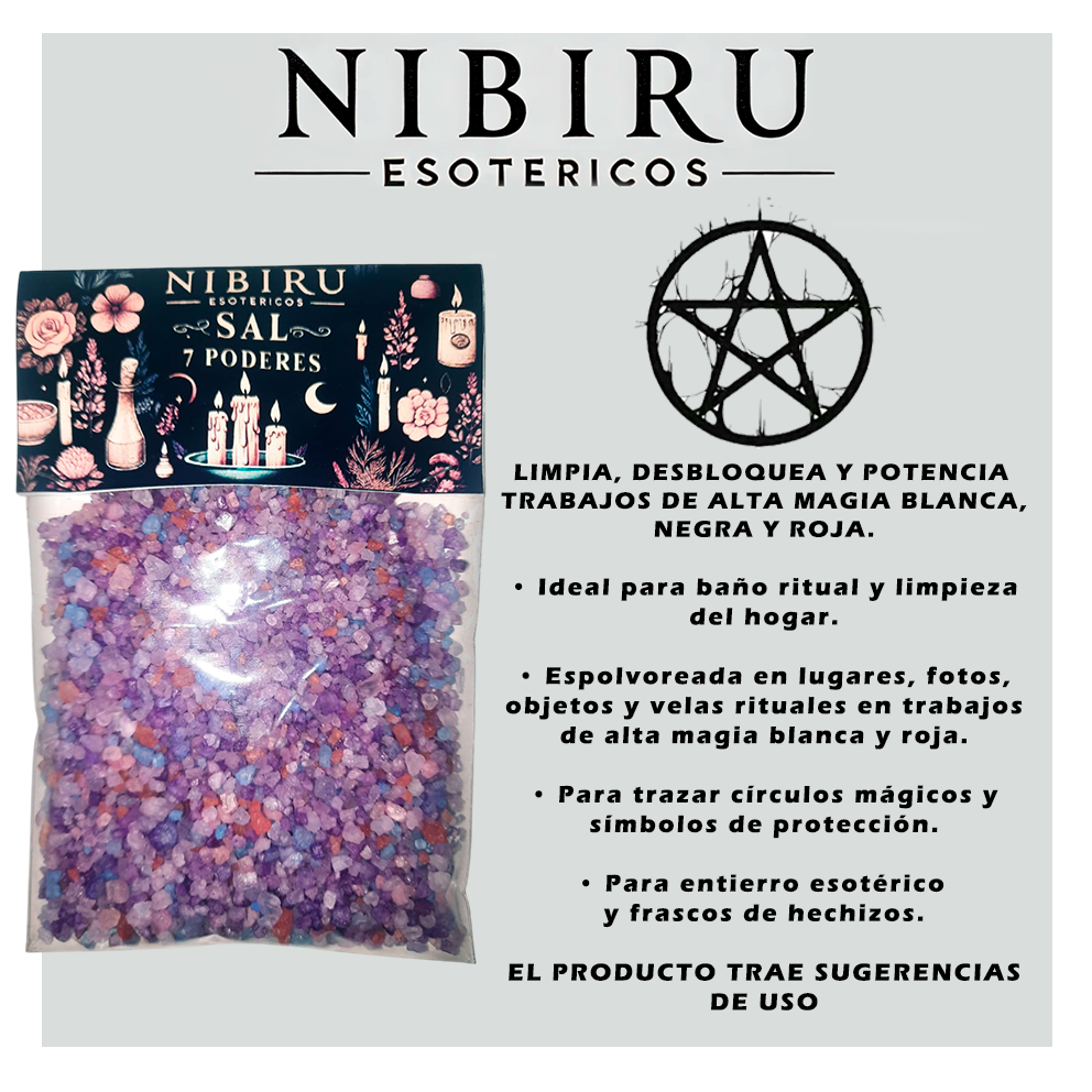 Sal esotérica consagrada para activar los siete poderes espirituales más invocados en trabajos de magia. Su fórmula trabaja en múltiples planos a la vez: protección, limpieza, apertura de caminos, atracción, dominación, justicia y evolución espiritual. Es ideal para quienes buscan fuerza, guía y resultados concretos en sus rituales. Compatible con alta magia blanca, negra o roja, según la intención del trabajo.